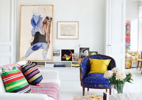 Here is an interesting way to play with colours in a primarily white environment - statement furniture pieces! There are no limits to experimenting here with colours, textures, patterns and even style of the furniture piece itself. They can be as distinct from the rest of the elements as possible, and will work beautifully in amping up the visual appeal of the place. You could either have one single statement piece of furniture or have multiple elements like colour-blocking cushions, throw blankets, and much more.
